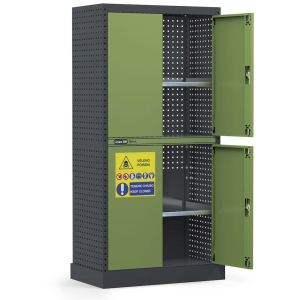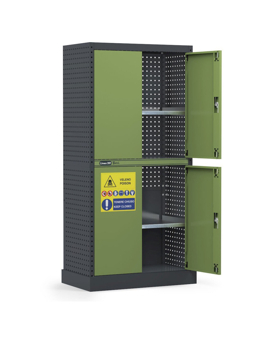 • Armadio per fitosanitari, pesticidi e prodotti chimici con vasta stagna esterna in lamiera verniciata, grigio antracite e verde. Progettato per organizzare fitofarmaci, pesticidi e prodotti chimici in un unico luogo accessibile al solo personale autorizzato