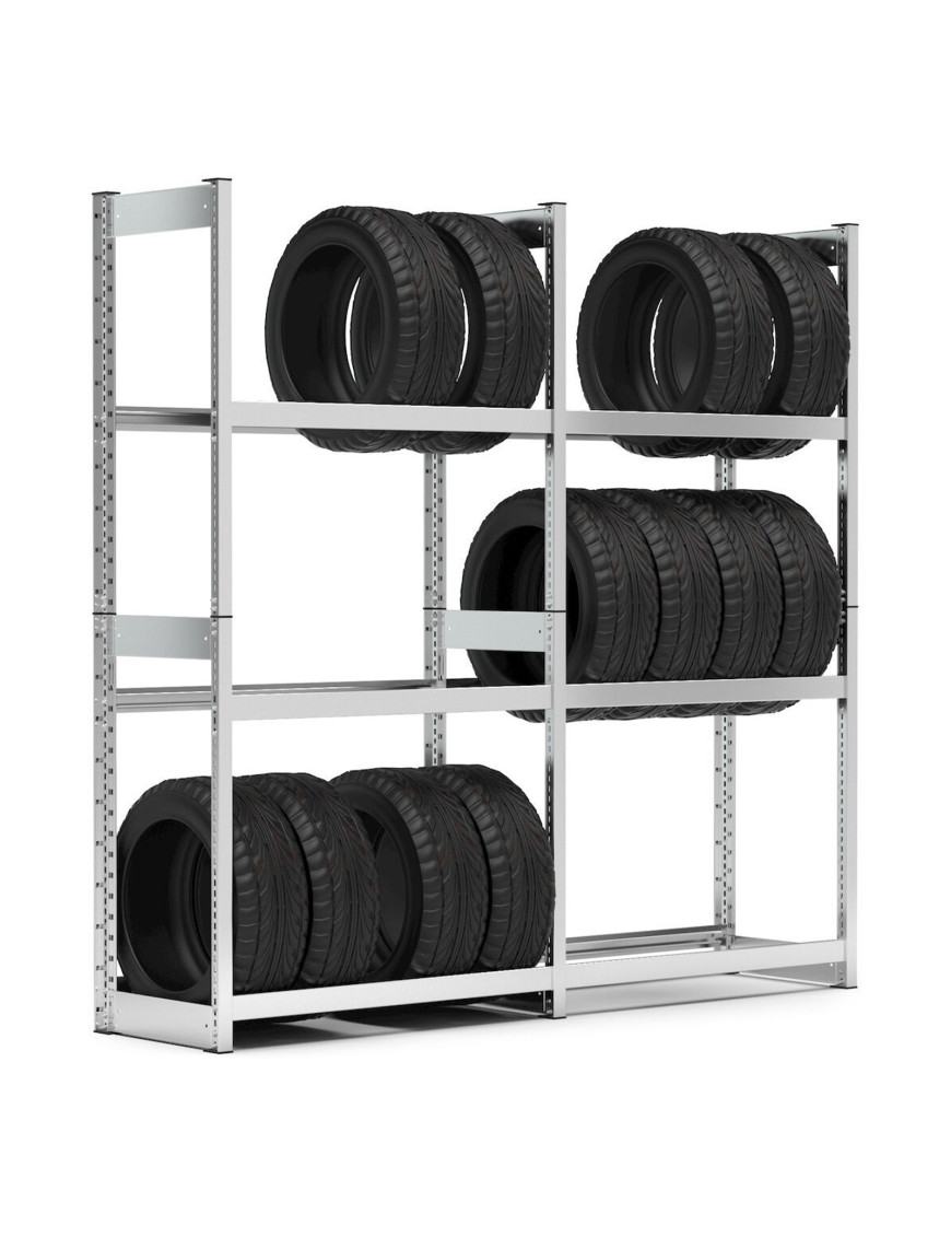 • Scaffalatura realizzata in lamiera zincata dotata di 12 supporti trasversali con una sagomatura studiata per lo pneumatico e una portata di 50 kg, fiancate comprese di tre traversini per garantire la resistenza agli urti e alle sollecitazioni quotidiane