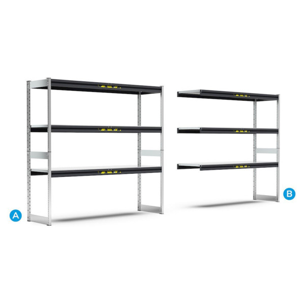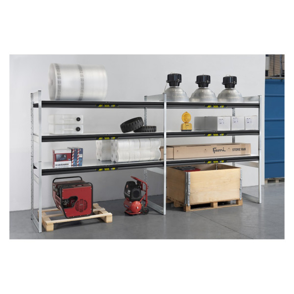 Scaffalatura realizzata in lamiera zincata con portata di 250 kg per coppia di correnti, elementi strutturali che uniscono 2 piani fessurati di 300 mm di profondità per creare campate da 2000 mm di larghezza