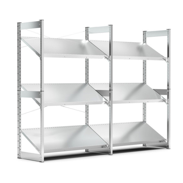 Scaffalatura realizzata in lamiera zincata, ogni ripiano può sostenere fino a 100 kg e le apposite staffe consentono di modificarne liberamente l'inclinazione tra i 5 e i 30°