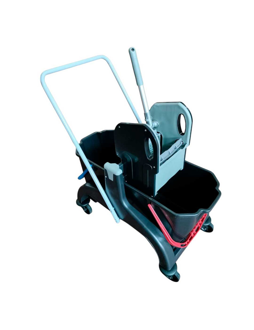 Codice carrello pulizie 8074: due vasche separate capienza totale acqua 43 litri. Misure cm 85 x 44 x 92, peso kg 10. Consigliato per ambienti fino a 100 mq