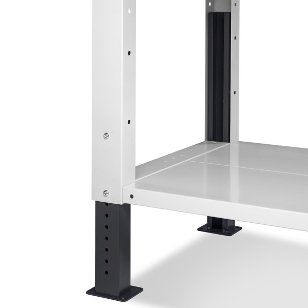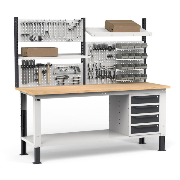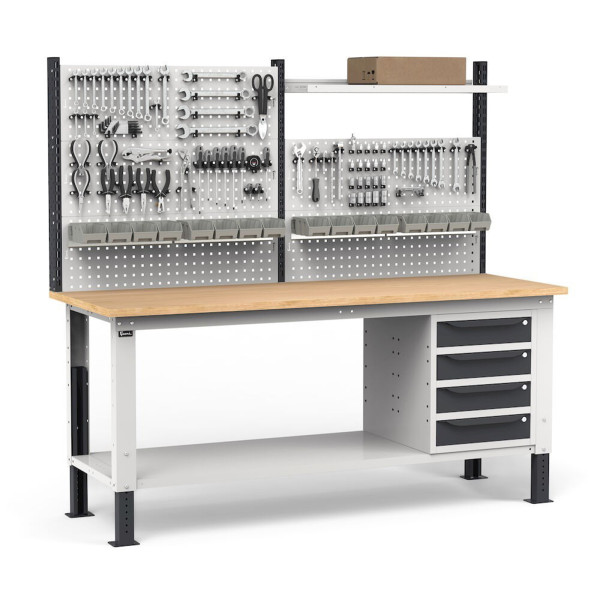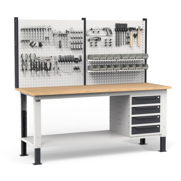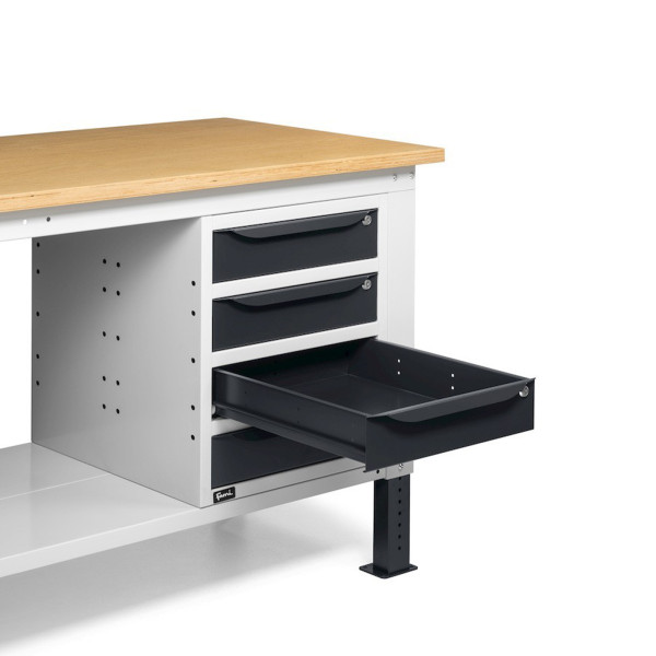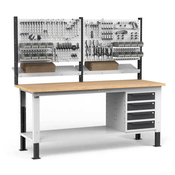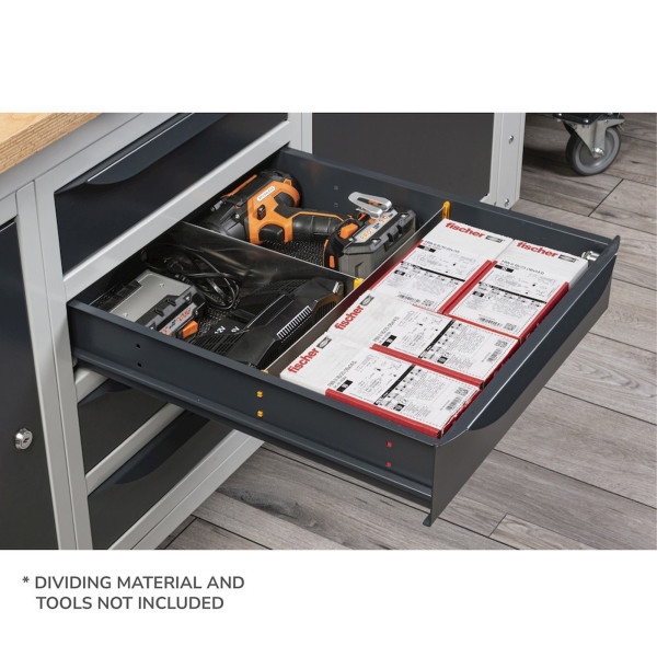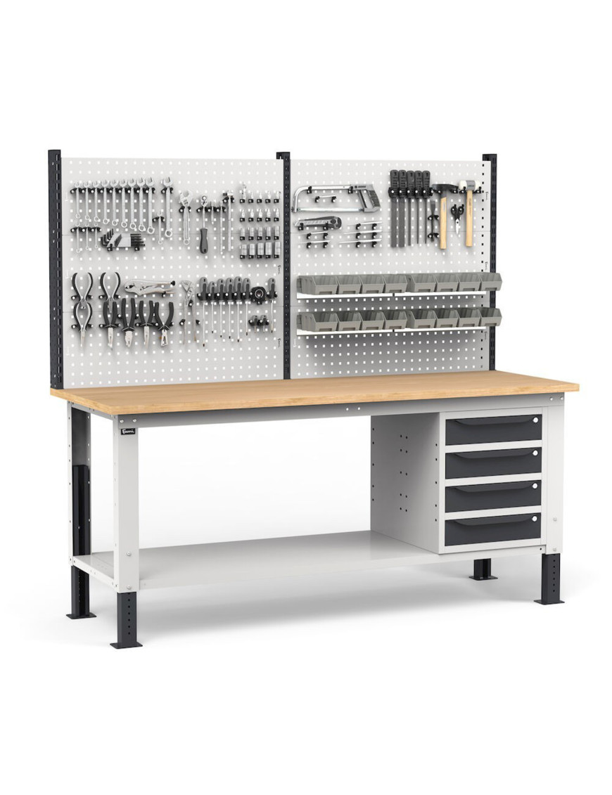 • Il banco ha un'altezza regolabile tra 732 e 1107 mm e una portata di 1000 Kg. Inoltre, è dotato di quattro cassetti per stoccare ed organizzare attrezzi e minuteria