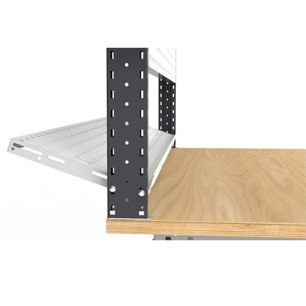 • Banco da lavoro regolabile in altezza Work Up, realizzato in lamiera verniciata nei colori grigio e antracite, con piano di lavoro in legno multistrato di faggio da 30 mm di spessore, pensato per officine e logistiche