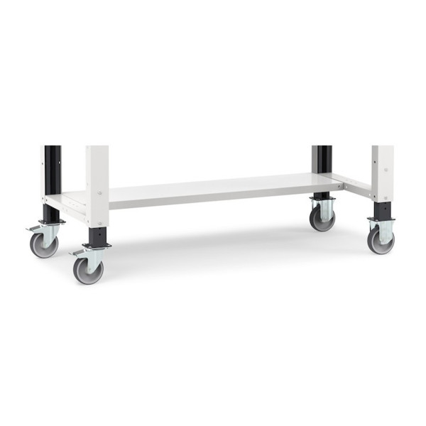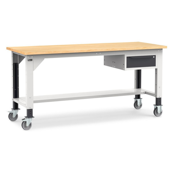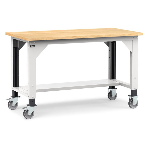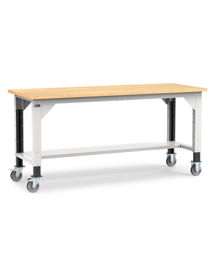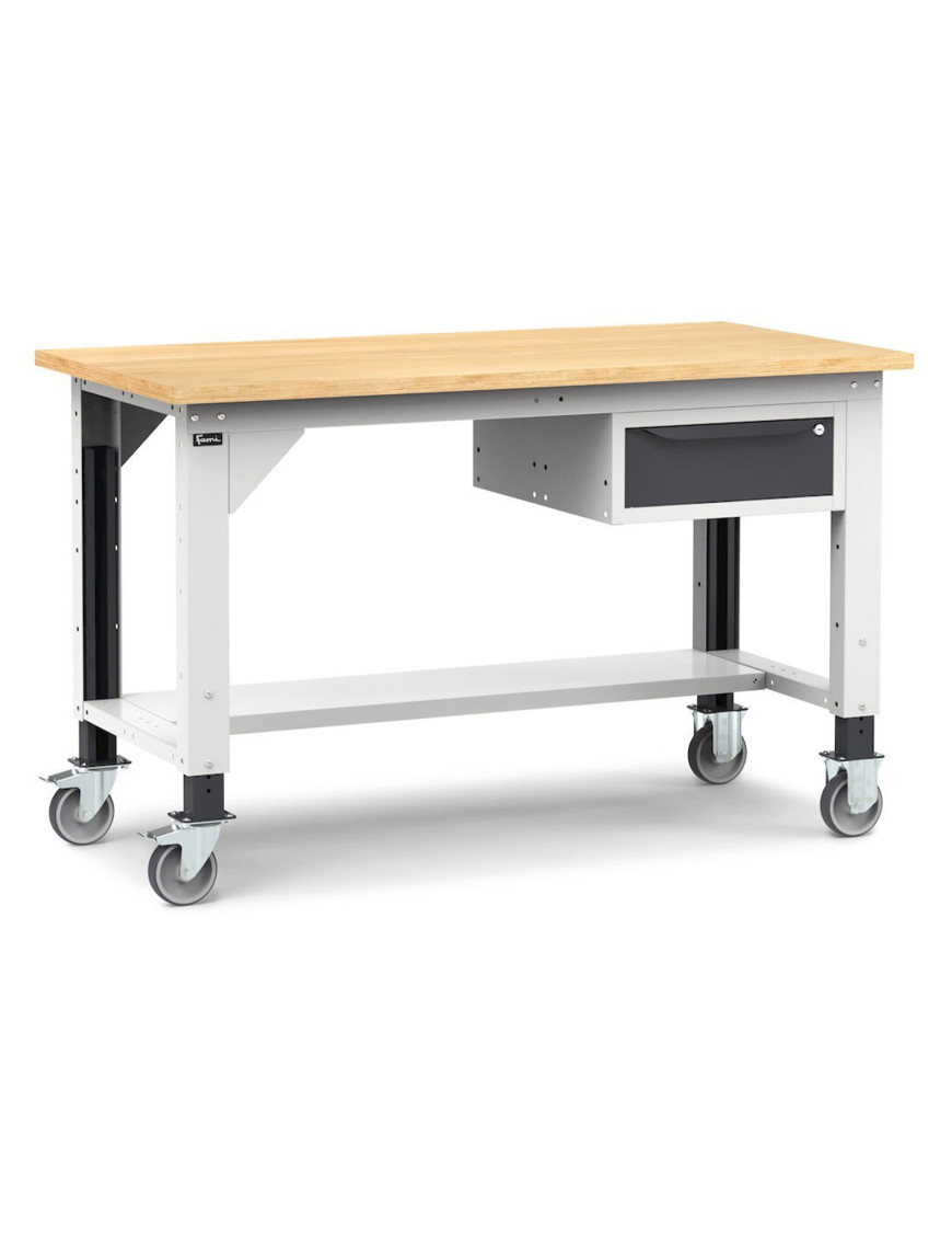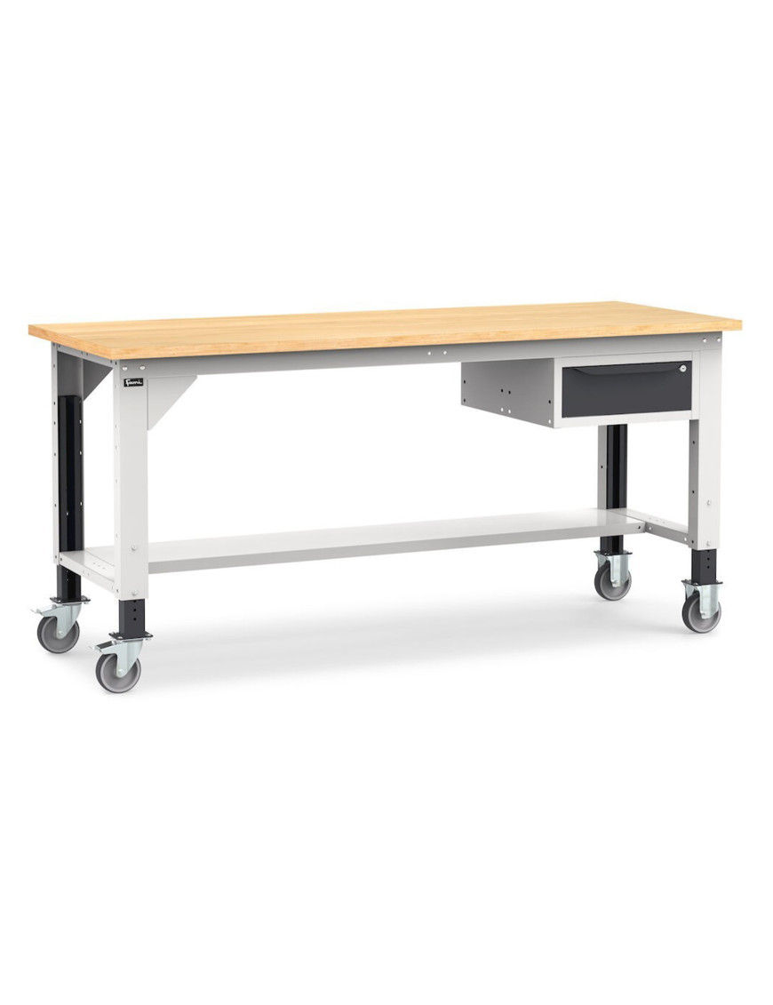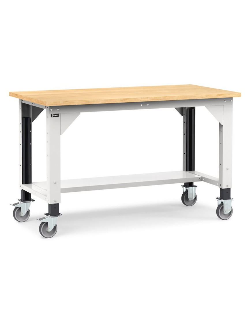 • Banco da lavoro con ruote ad altezza variabile e piano in legno multistrato di faggio da 30 mm