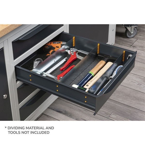 • Le due ruote con freno assicurano il blocco totale del banco e ne evitano lo spostamento involontario per garantire sicurezza ed efficacia durante il lavoro. Accessoriabile con una o quattro cassettiere