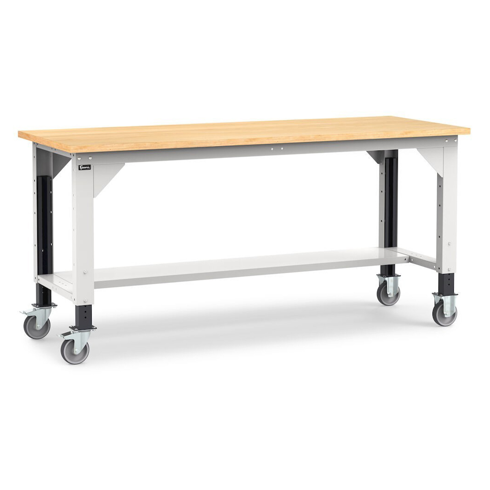 • Banco da lavoro con ruote ad altezza variabile e piano in legno multistrato di faggio da 30 mm