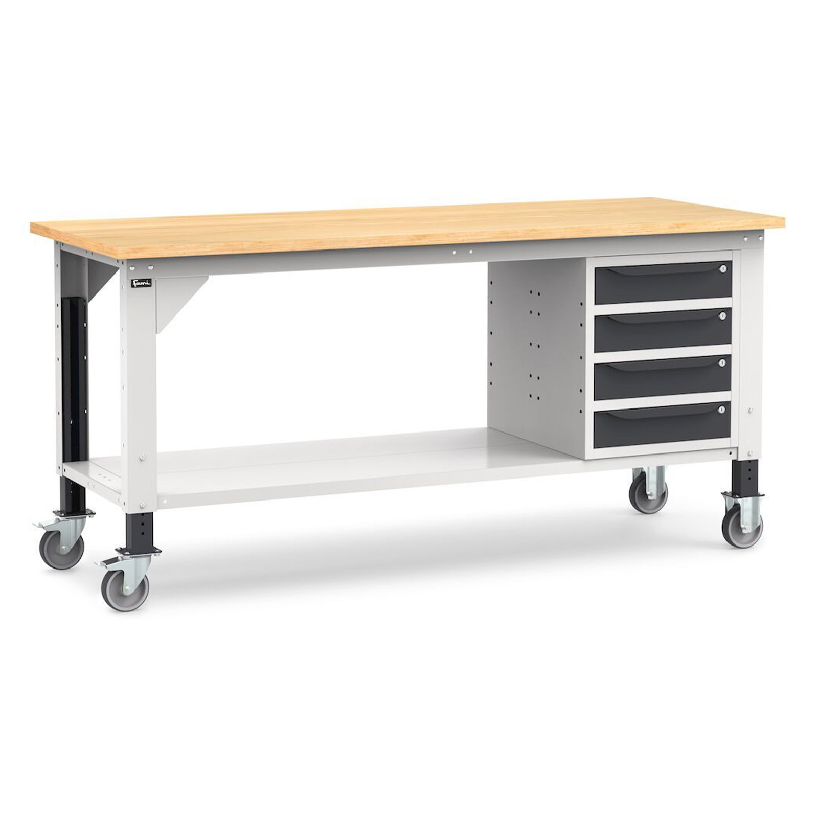 • Banco da lavoro con ruote ad altezza variabile e piano in legno multistrato di faggio da 30 mm